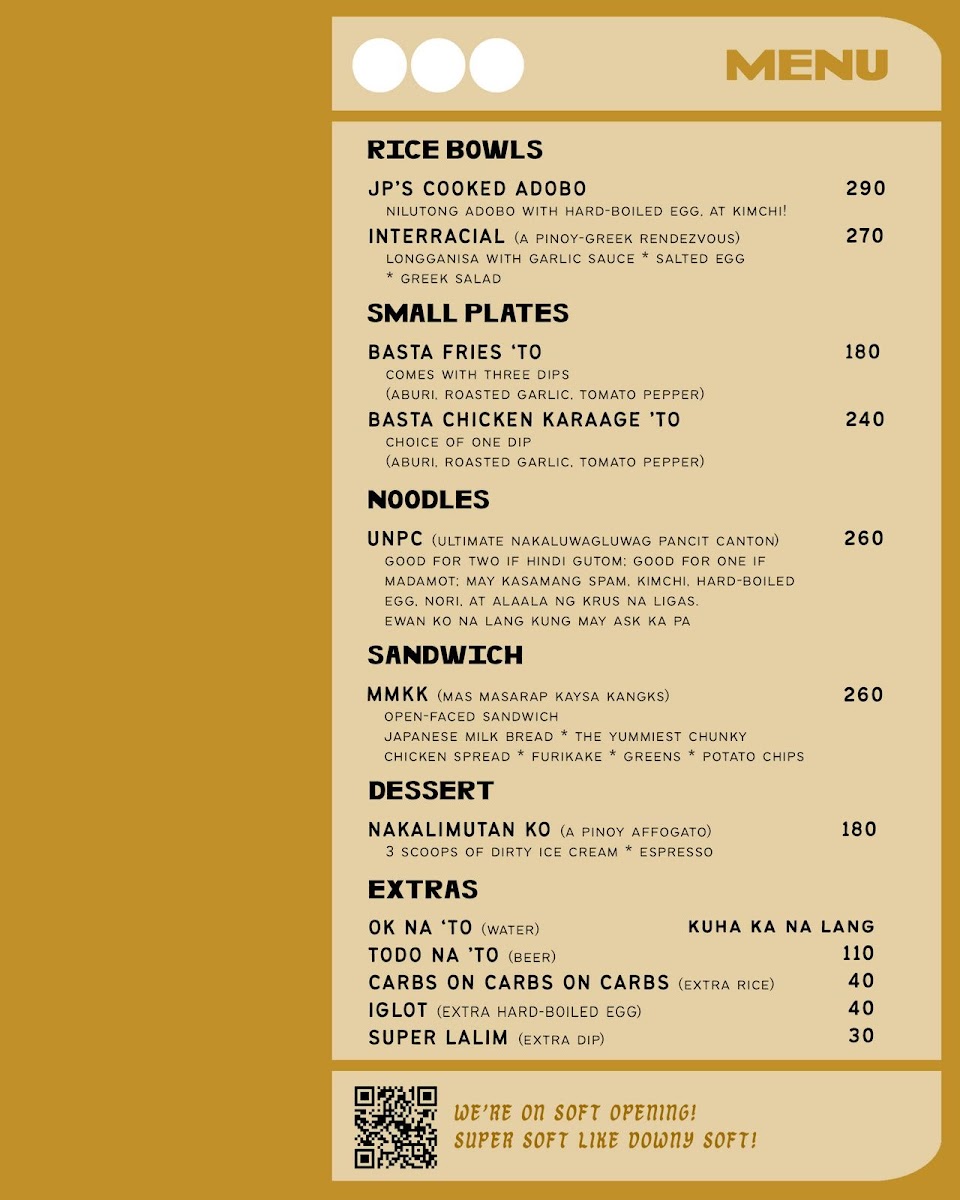 Welcome to Basta Cafe, the latest haven for food lovers in Quezon City! With its quirky, welcoming vibe, this cafe perfectly melds delicious food and creative drinks. The standout items on the menu include the MMKK Mas Masarap Kaysa Kangks, an open-faced sandwich featuring airy Japanese milk bread topped with a luscious chunky chicken spread, furikake, and fresh greens, all for ₱300.00. If you're craving something heartier, try the Yummiest Overloaded Ha Hotdog Premiumer, packed with ethically sourced ingredients and indulgent toppings.